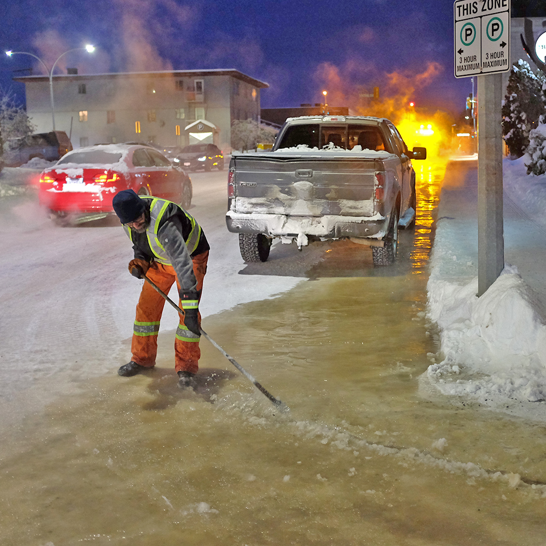 Please be advised that City crews are at the scene of a water main break at 6th Avenue and Victoria Street in downtown Prince George. The water main, which is about 15cm in diameter and built out of cast iron, was installed in 1956, but is not connected to the water main at 6th and Vancouver, which broke early this morning.