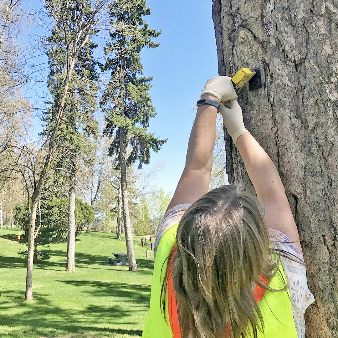 The week, City and Provincial Government staff worked to attach the pouches to trees in Lheidli Tβenneh Memorial Park, Connaught Hill Park, Rainbow Park, Memorial Park Cemetery, and to the blue spruce trees found near Highways 16 and 97. Typically, the pouches must be attached to trees by the end of April to be effective, but this yearβs long winter allowed the period to be extended into May. Beetles are expected to begin leaving their host tree and to start trying to infest new trees within the next week.