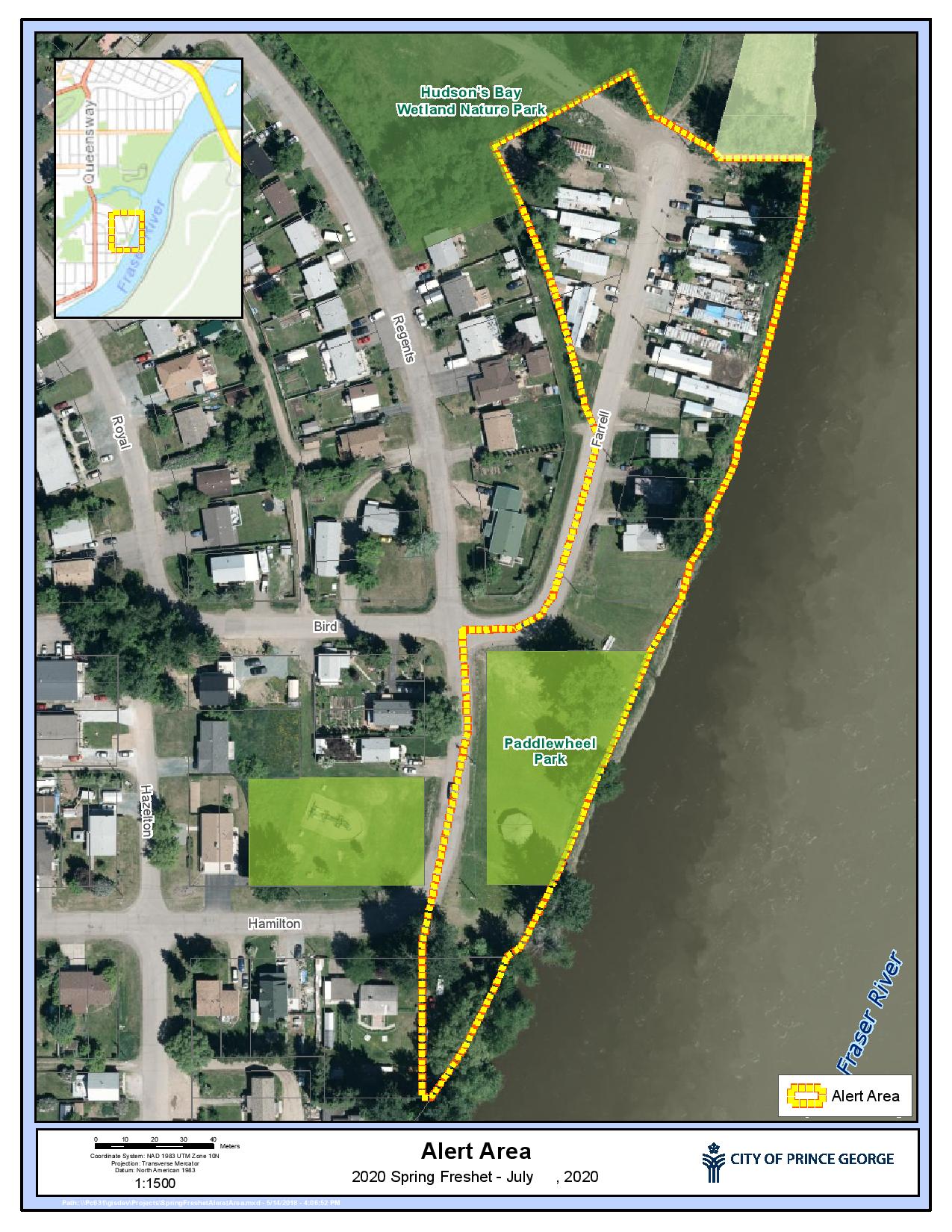 The City of Prince George is issuing an evacuation alert for the residents of Farrell Street across from Paddlewheel Park due to significant risk of flooding from the Fraser River. Please refer to the attached map of the areas currently under alert.