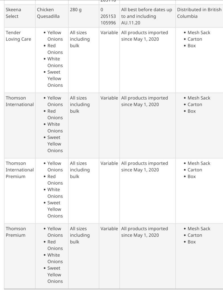 Industry is recalling various products made with onions grown by Thomson International Inc., Bakersfield, California (USA), from the marketplace due to possible Salmonella contamination. Consumers should not consume the recalled products described below. Retailers, distributors, manufacturers, and food service establishments such as hotels, restaurants, cafeterias, hospitals, and nursing homes should not serve, use, or sell the recalled products described below.
