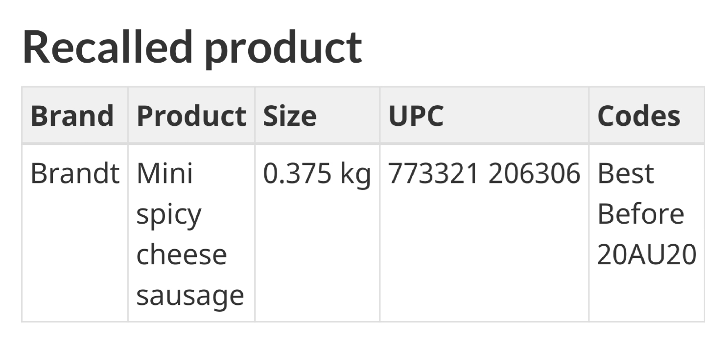 OTTAWA, ON: G. Brandt Meat Packers Ltd. is recalling Brandt brand mini spicy cheese sausage from the marketplace due to possibleΒ Listeria monocytogenesΒ contamination. Consumers should not consume the recalled product described below.