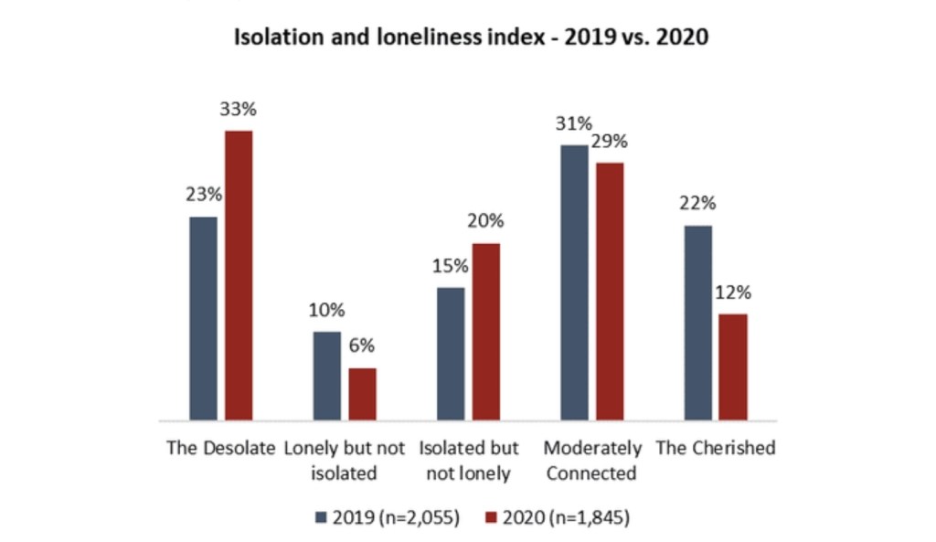- While some older Canadians are having a very difficult time with isolation and loneliness, they are also most likely to be within the Cherished and Moderately Connected groupings β those enduring the pandemic best. Two-in-five young men and women are among the Desolate and are experiencing considerable isolation and loneliness.