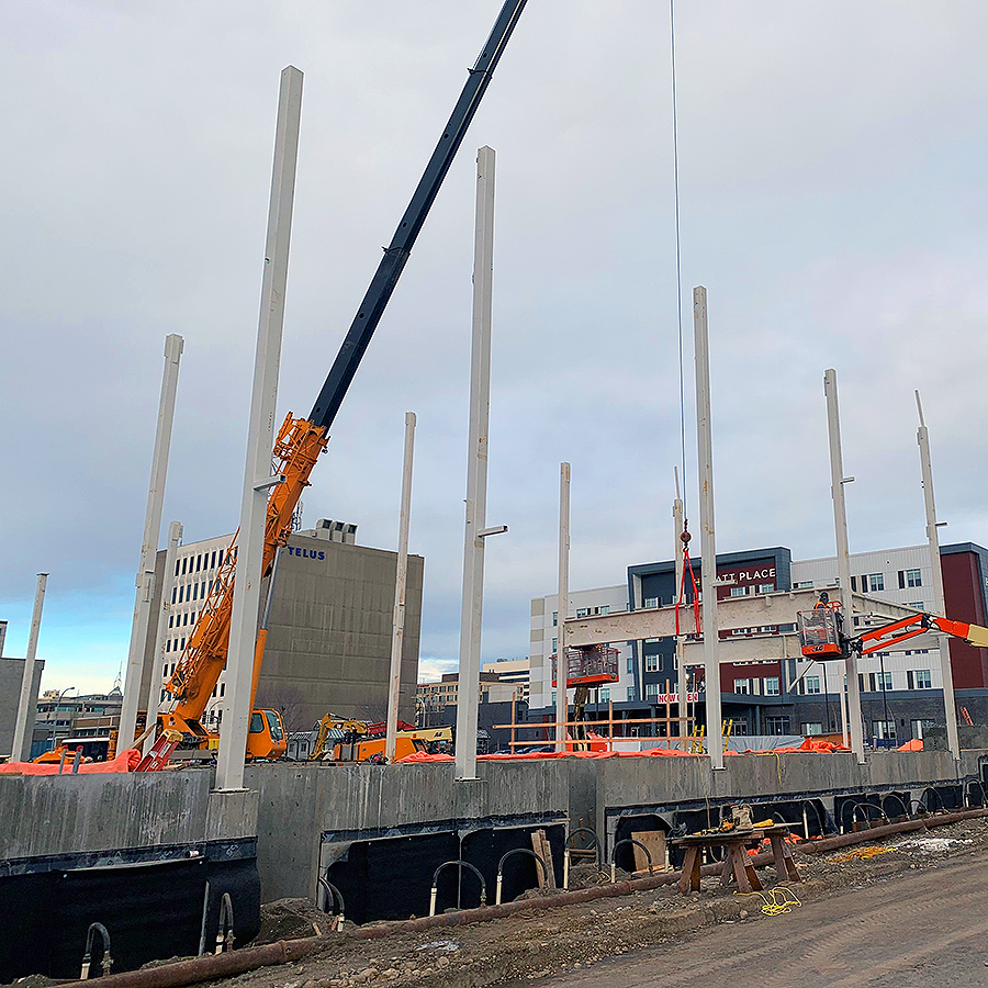 PRINCE GEORGE, BC: Starting today, local construction watchers will see the City of Prince George’s new downtown pool begin to take shape and rise into the air. This morning, crews began installing large steel beams near Dominion Street and between 7th and 6th Avenues.