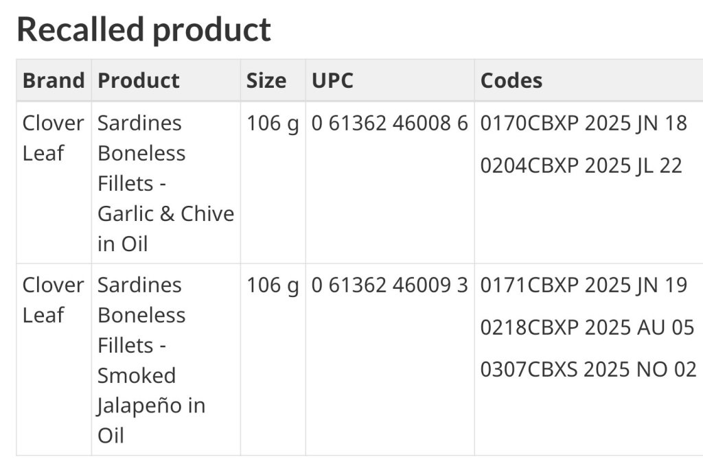 OTTAWA, ON: Clover Leaf Seafoods Corp. is recalling Clover Leaf brand Sardines Boneless Fillets – GarlicΒ &Β Chive in Oil and Sardines Boneless Fillets – Smoked JalapeΓ±o in Oil from the marketplace because they may permit the growth ofΒ Clostridium botulinum. Consumers should not consume the recalled products described below.