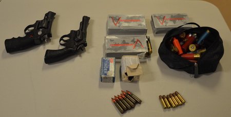 Members of the Prince George RCMP Downtown Safety Unit executed a Controlled Drugs and Substances Act investigation at a residence on the 1400 block of Milburn Avenue. Members seized these loaded revolvers, later found to be a BB guns, off a person at that location. Various forms of ammunition for firearms other than the BB gun were also located at the residence.