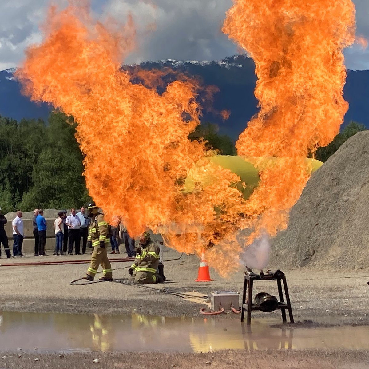 This training is part of a program offered by ERAC, which provides live situation exercises to Fire Rescue Services across the country, most recently with the Regional District of Kitimat-Stikine and City of Terrace. The simulation and exercises are moving from city to city by railcar and involve the use of a large propane burner to produce a large, intense flame to reproduce a propane fire incident for training purposes.