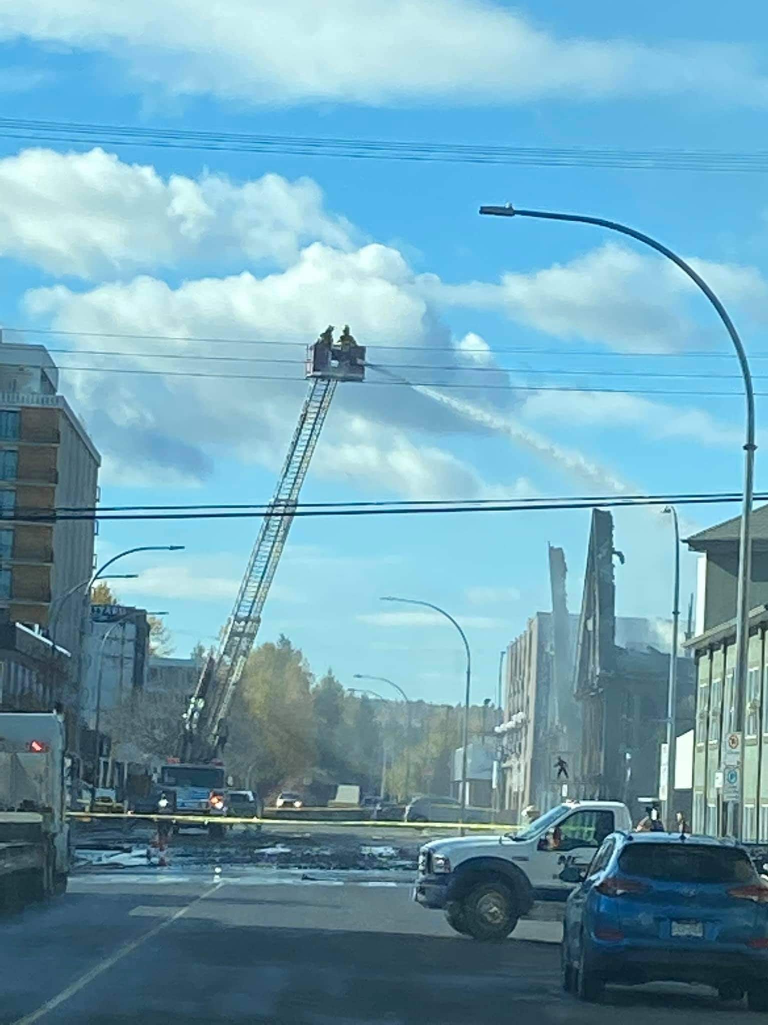 Fire has destroyed (to the right) the Re/Max Realty building on Brunswick Street in downtown Prince George on October 10, 2021. – PJXM Photo