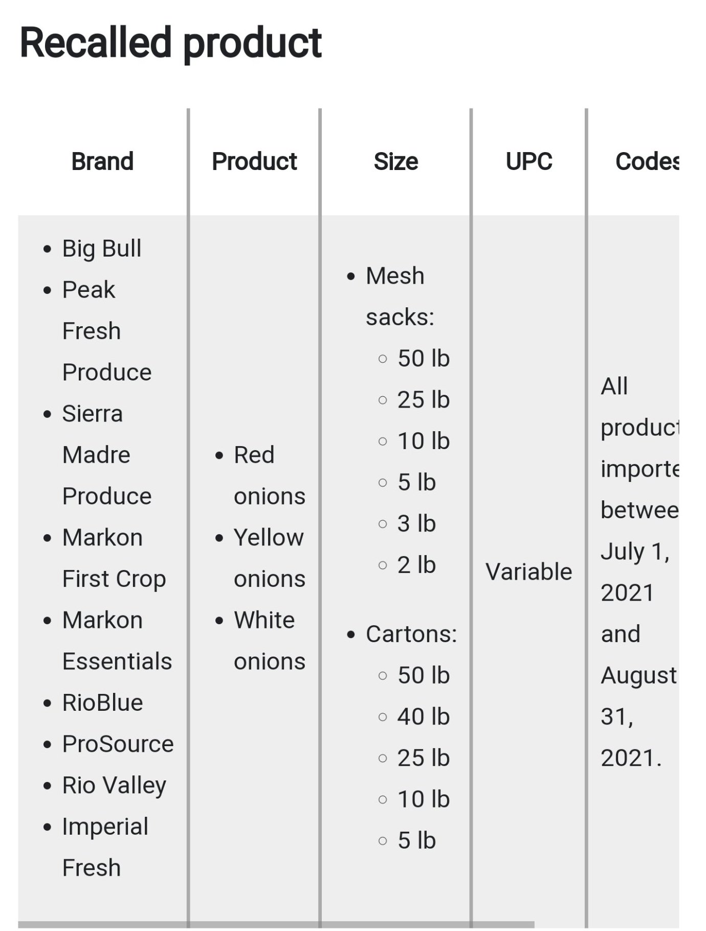 Consumers should not consume the recalled products described below or foods containing these raw onions. Retailers, distributors, manufacturers, and food service establishments such as hotels, restaurants, cafeterias, hospitals, and nursing homes should not serve, use, or sell the recalled products described below.