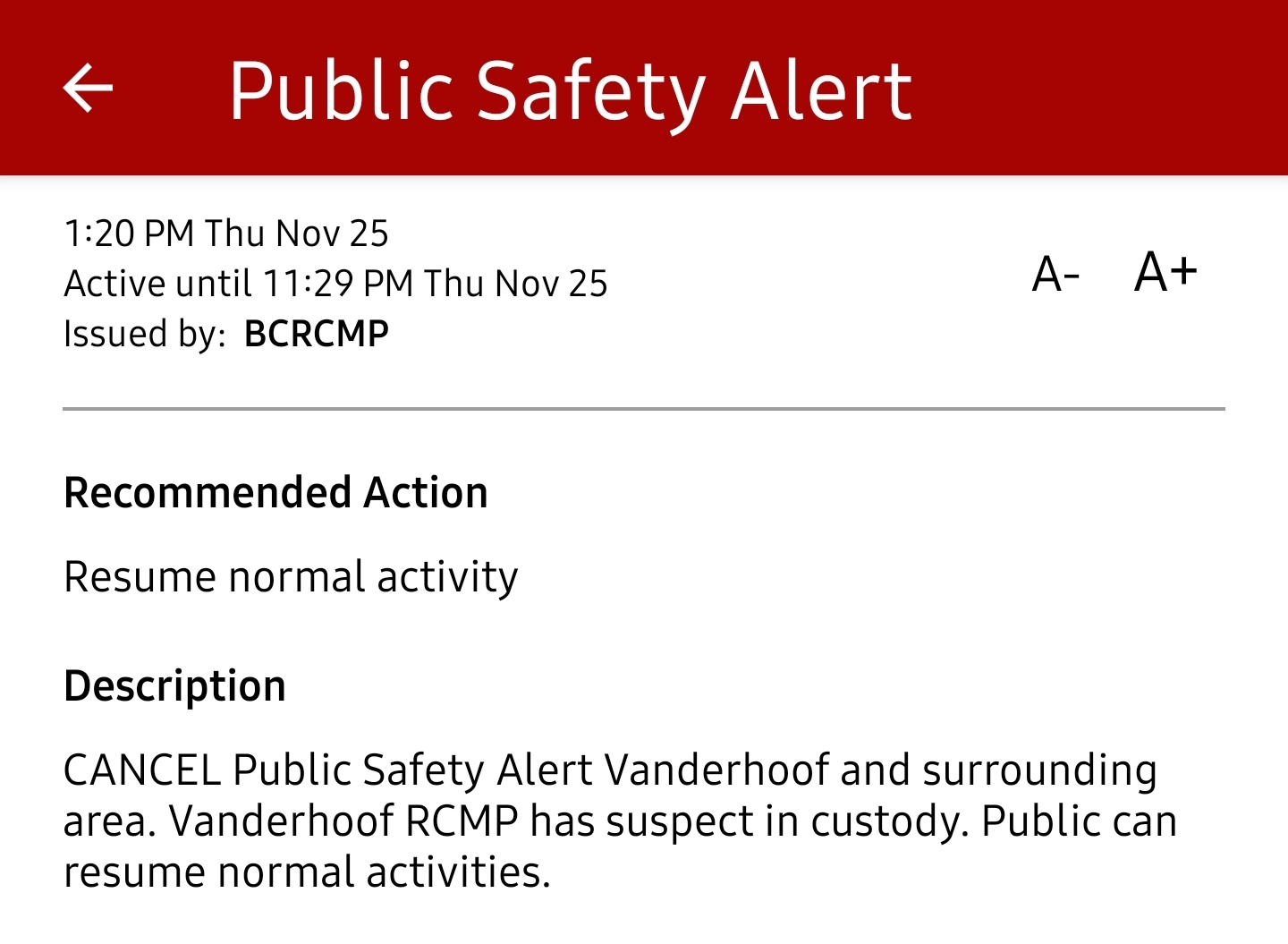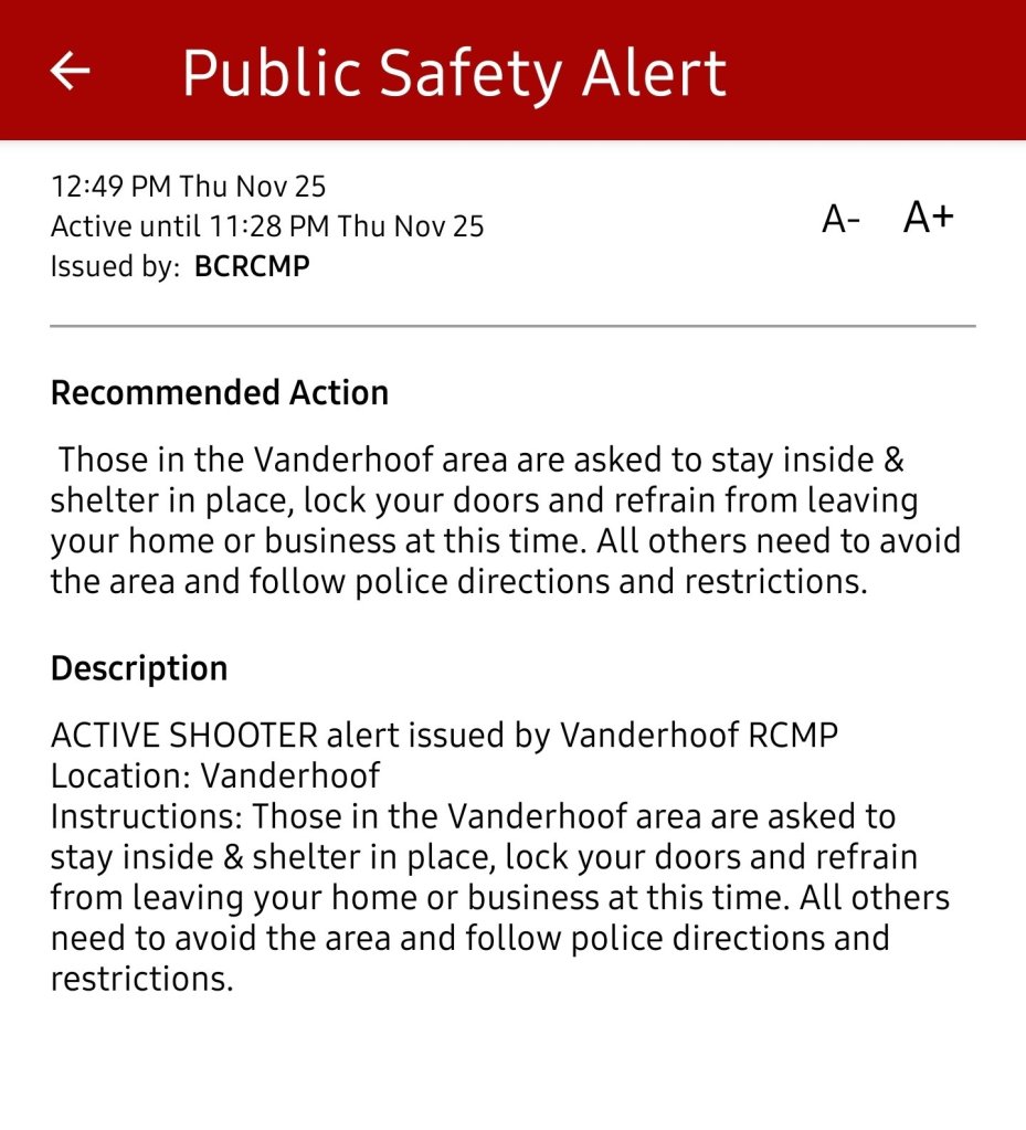 ENDED: Active shooter in Vanderhoof has been taken into custody. Emergency Alert has now ENDED.