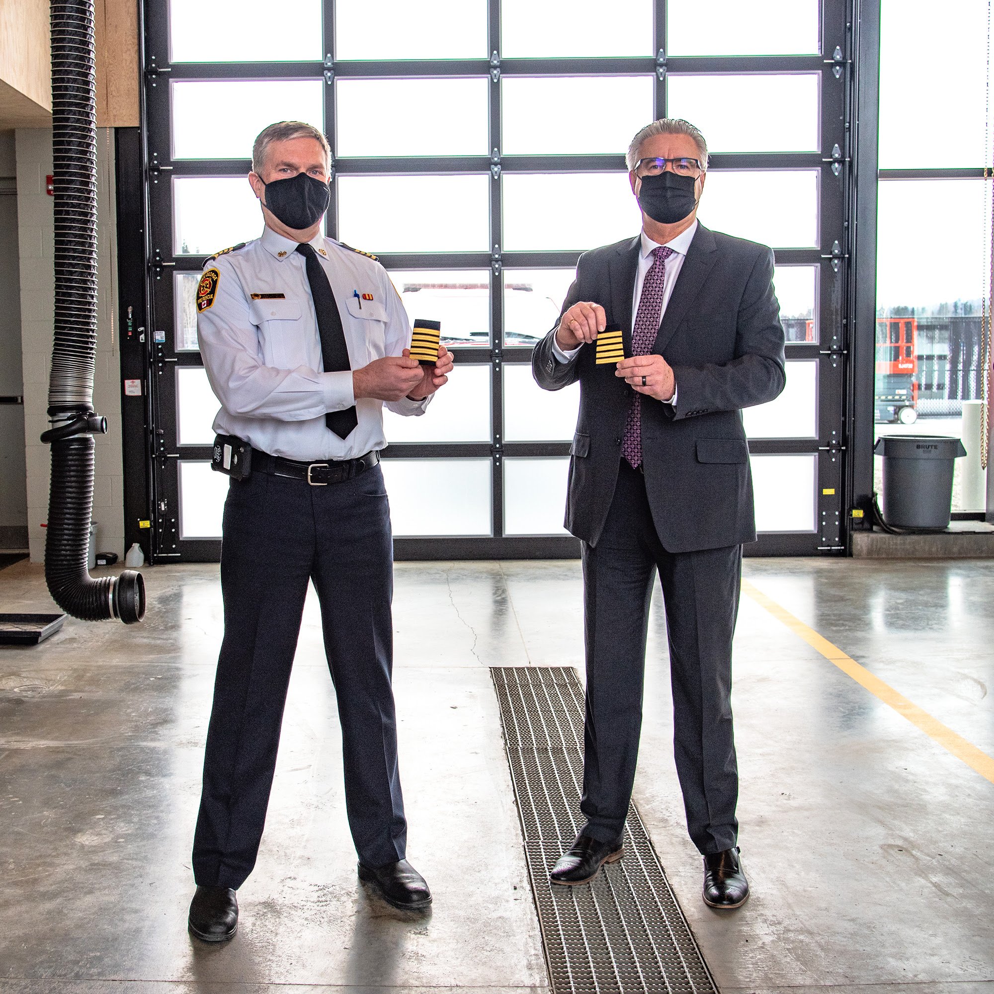 Cliff Warner and Mayor Lyn Hall display Chief Warner’s new “five bar” epaulets, signifying his new rank as fire chief.