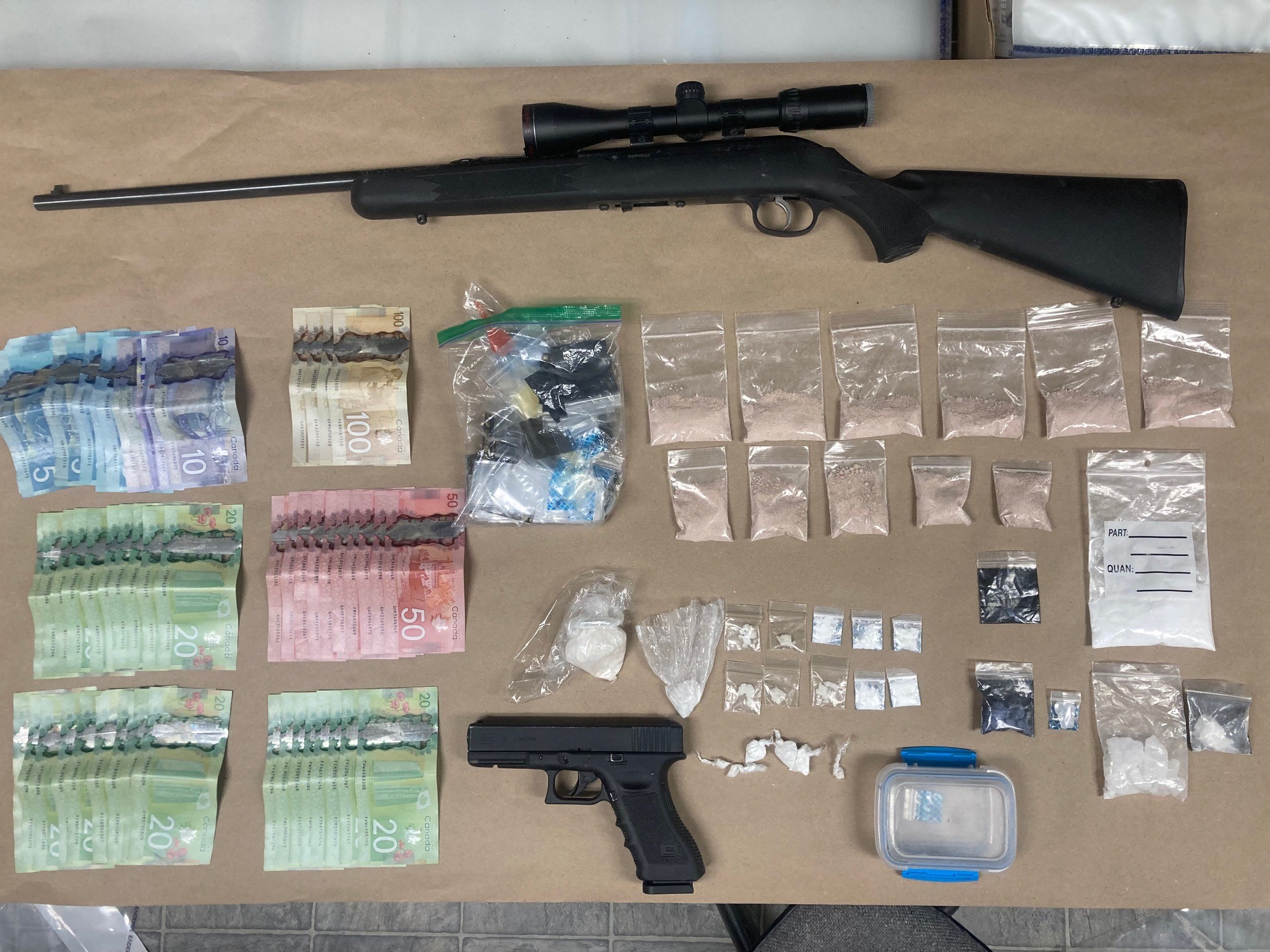Items seized during two separate Search Warrants in Dawson Creek in April 2022.