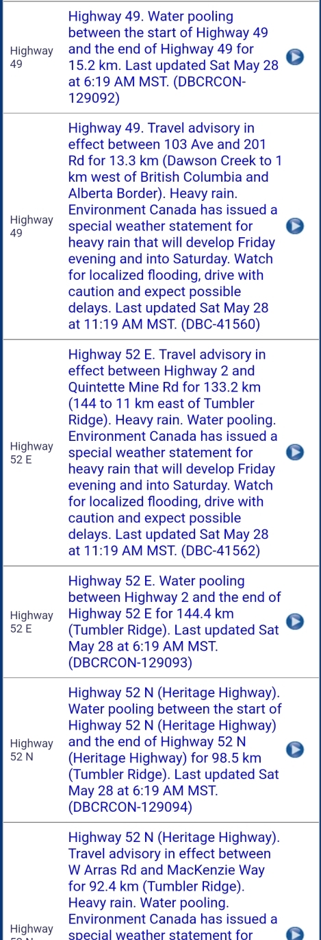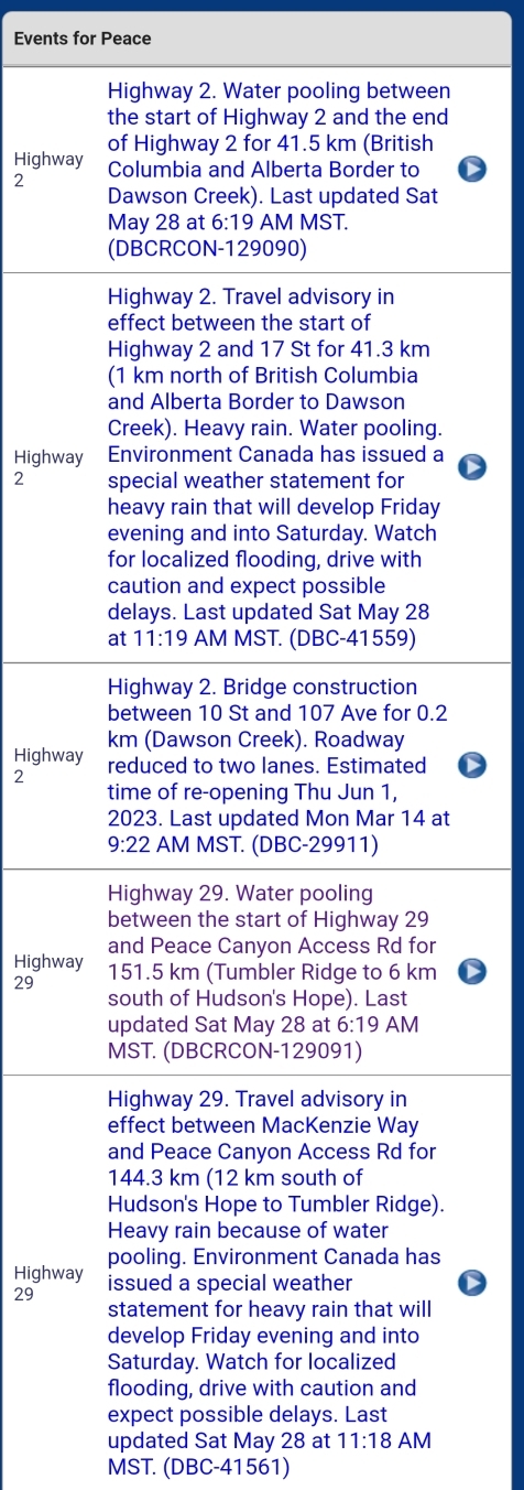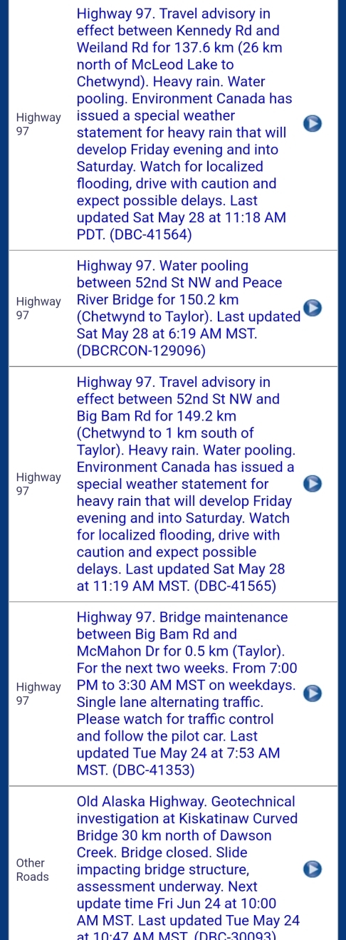 Below is a list of travel advisories in the BC Peace due to heavy rain and water pooling. Use caution if heading out today. The images are NOT links to Drivebc.ca. Please visit Drivebc.ca for the latest.