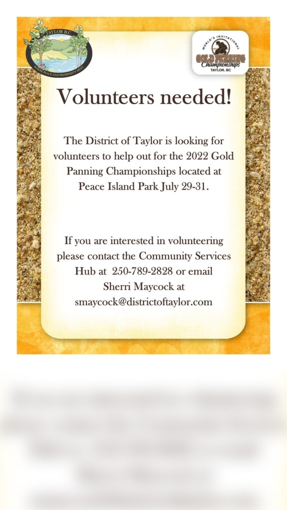 Below is information provided to PJXM on the upcoming Taylor Gold Pan Championships that will be taking place at the end of July 2022 in Taylor, BC, south of Fort St. John. The event is looking for volunteers and vendors! See below for all the details and event schedule. We have split the information into picture categories.