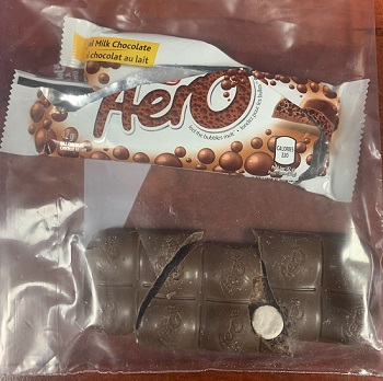 Police say on November 1, 2022, a parent attended the Fort St. John detachment and provided a full size Aero chocolate bar with a white circular pill stuffed inside the chocolate bar. The parent stated that the packaging of the Aero bar felt weird. Upon opening the chocolate bar, a portion of the chocolate bar appeared to be flakey. The parent brushed off the flakey portion of the chocolate bar and a white pill was found underneath.