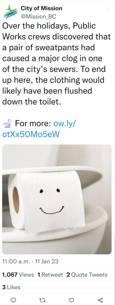 On January 11, 2023, the City of Mission, a community located down in BC’s Lower Mainland, put out a media release saying someone had flushed sweatpants down the toilet, which ended up causing a clog in the system because of where the pants were located. Say what?!