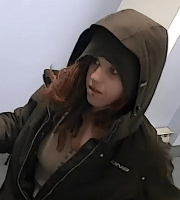 The suspect is described as a young female with shoulder-length brown hair. She was wearing a dark hoodie and a brown or black coat, cropped black pants, a brown shirt and black winter boots.