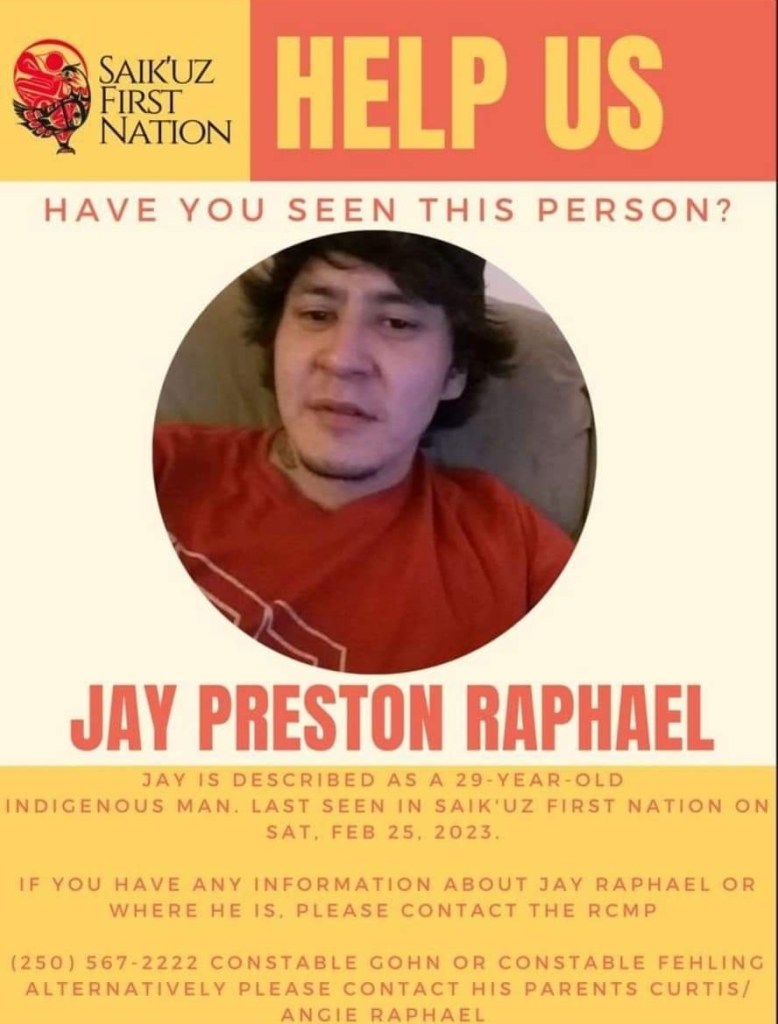 Missing is 27 year-old Jay Preston Raphael, who was seen walking away from a residence in Saik’uz, BC on February 26, 2023.