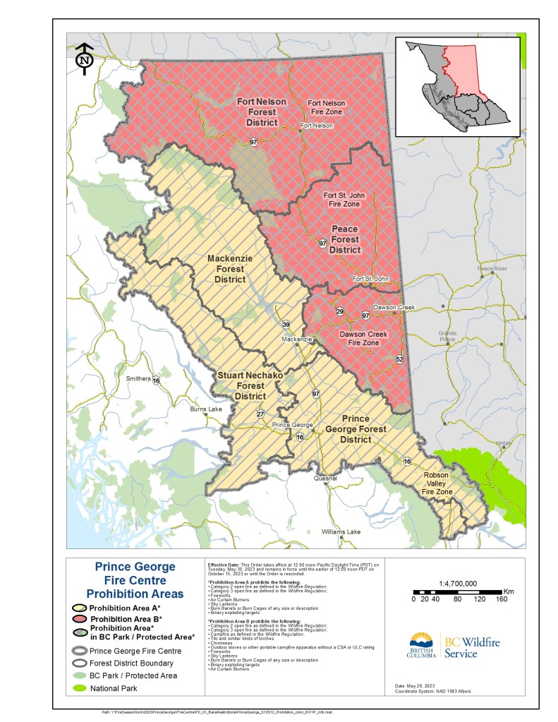 Category 2 and 3 open burning prohibitions remain in place throughout the Prince George Fire Centre.