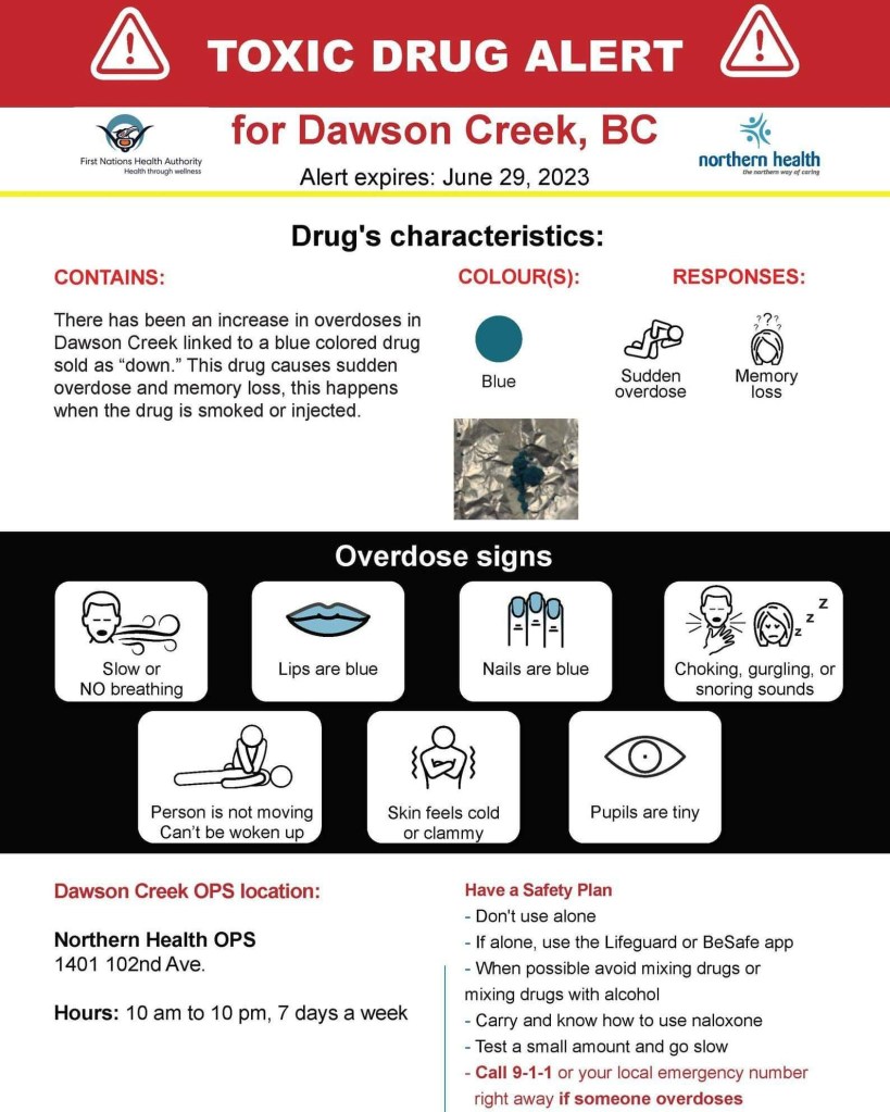 There has been an increase in overdoses in Dawson Creek linked to a blue colored drug sold as βdown.β This drug causes sudden overdose and memory loss and happens when the drug is smoked and injected.