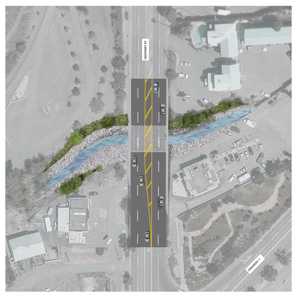 The Highway 97 Cache Creek Crossing Restoration Project includes the installation of a bridge to replace the culvert under Highway 97 where it crosses Cache Creek. The new four-lane bridge will be designed to handle peak river flows and debris, especially during spring freshet. It will accommodate increases in peak water flows caused by climate change and will be built to ensure structural stability against erosion.
