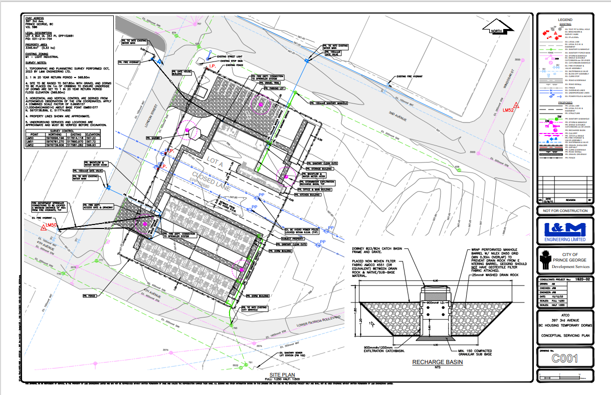 According to the Servicing Brief provided by BC Housing, the Transitional Housing Facility Project proposes to accommodate 44 units for overnight sheltering with additional amenity/storage trailers with use of temporary trailers. The site design population has been calculated based on up to two people per unit for a maximum population of 88 people. BC Housing has indicated that the Transitional Housing Facility Project would include drinking water, washroom facilities, and food services.