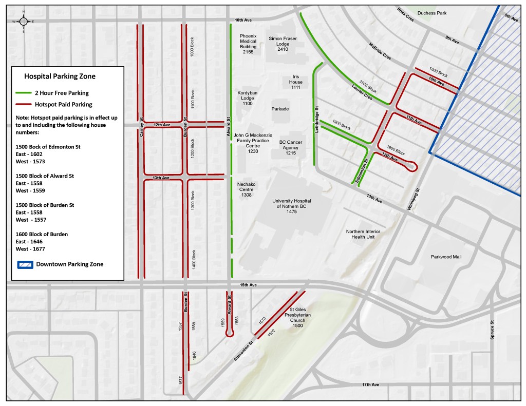 As part of the proposed changes, two-hour free parking will remain in areas immediately surrounding key medical facilities affected by construction of the new parkade, including UHNBC, the Northern Interior Health Unit, and others. This aims to provide continued parking access for short-term visitors and patients.