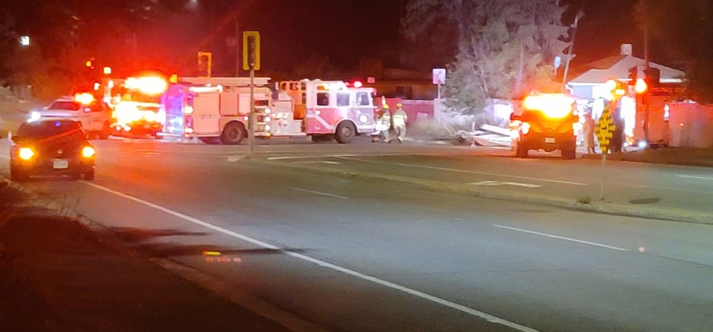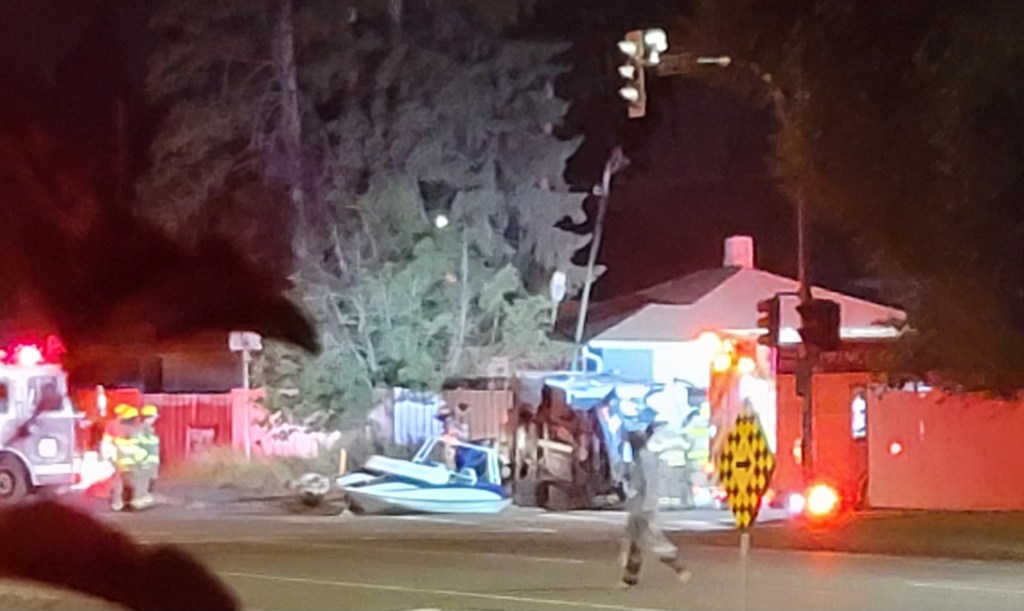 The incident began at 12:23 AM, when a pickup truck hauling a boat slammed into a BC Ambulance at the intersection. The impact of the crash sent the ambulance onto its side with the pickup truck coming to a rest behind the ambulance, nearly hitting a home on the corner of Carney Street.